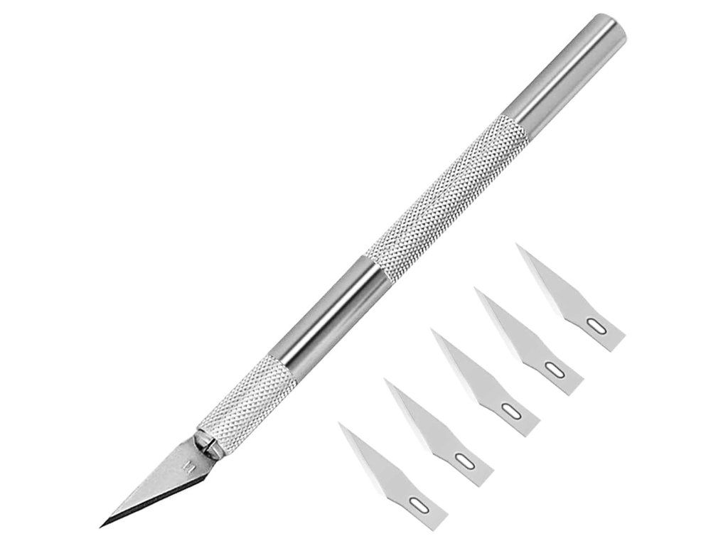Modelářský nůž s vyměnitelnými čepelemi je kovový nástroj s hliníkovou rukojetí a nerezovými čepelemi určený pro přesné řezání — ať už při modelování, scrapbookingu, řemeslech nebo jemných domácích pracích.