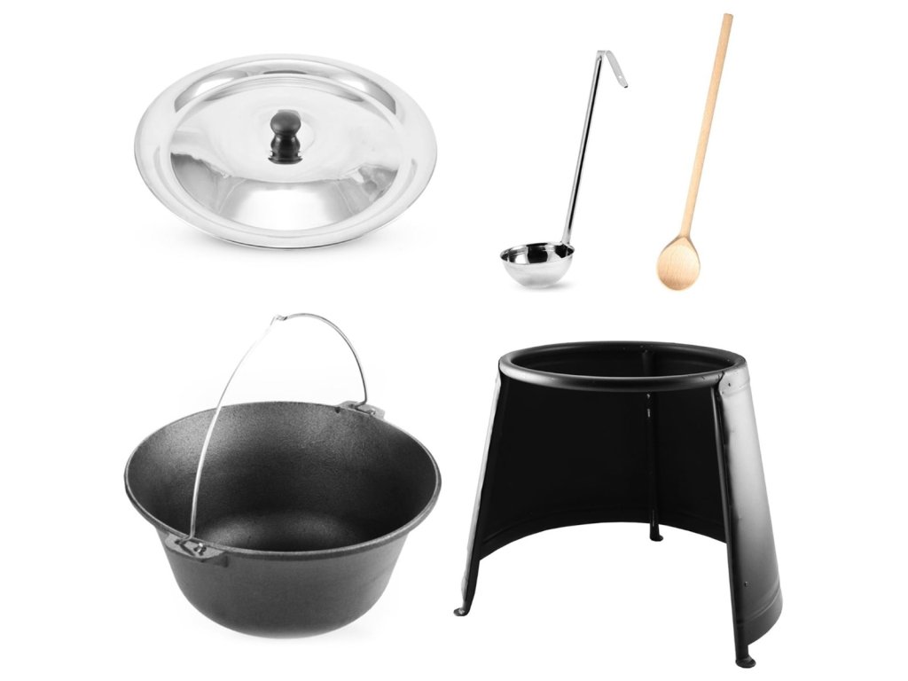 - Sestává ze stojanu pod kotlík, kotlíku, poklice, naběračky a vařečky