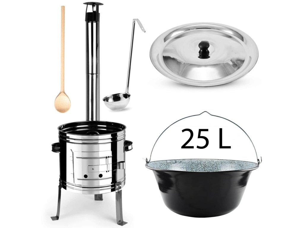 - Kotlíkový set na guláš sestává z kotliny, kotlíku, poklice, vařečky a naběračky