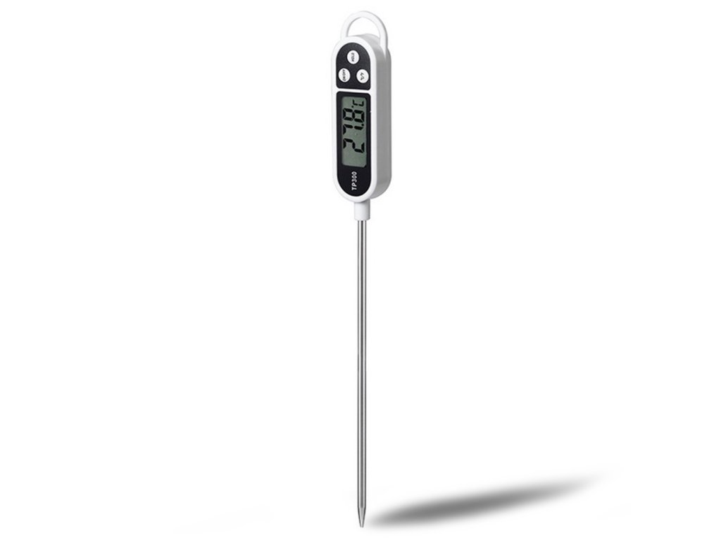 Digitální LCD teploměr se sondou, TFY AG254E je určený k měření teploty uvnitř připravovaného jídla. Vhodný na maso, mléko, těsto, čaj a jiné. Velký LCD displej na odečítání teploty. Teploměr umožňuje pohodlnou regulaci teploty jakéhokoliv produktu. Neocenitelné, pokud si nepřejete spálit / péct koláče nebo pečení. Teploměr je vybaven dlouhou jehlou z nerezavějící oceli zakončenou snímačem teploty. Teplotní rozsah: -50 ° C až + 300 ° C +/- 1 ° C. Jednotky: C, F. Délka sondy je 14,30cm. Napájení: 1x AG13 baterie (součástí balení). Automatické vypnutí šetří energii po 15 minutách. Praktický otvor v horní části na zavěšení teploměru. Funkce HOLD.