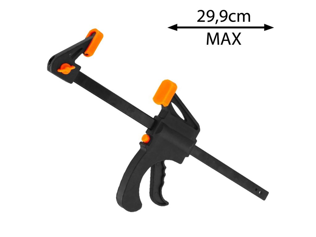 Návod: Stiskněte a podržte oranžové tlačítko v horní části rukojeti a zatáhněte za rukojeť dolů tak, aby se roztáhla na požadovanou velikost. Nedržte zároveň stlačenou rukojeť pistole, protože pak svěrka nepůjde roztáhnout. Chcete-li fixovat, zatlačte pistoli, dokud není svorka pevně na svém místě, nebo přidržte oranžové tlačítko a vytáhněte svorku směrem nahoru.