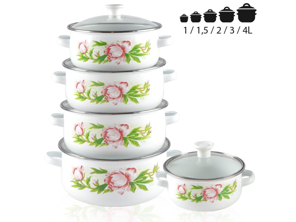 TIDAL 1872 Smaltované hrnce KVĚTINY se skleněnými poklicemi 10ks, bílé